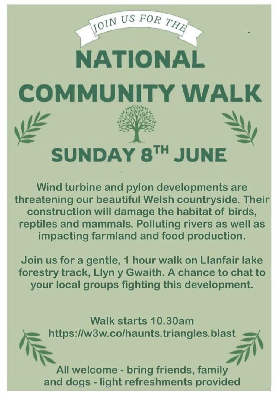 Hoffem eich gwahodd i ddigwyddiad cymunedol pwysig sy’n cael ei drefnu gan ein ffrindiau yng ngrŵp Caru Teifi, sy’n cyd-fynd â’n pryderon cyffredin am ddiwydiannu cefn gwlad hardd Cymru. Felly, p’un a ydych yn sefyll yn erbyn y peilonau a/neu’r parciau ynni, ymunwch â’r daith gerdded ar ddydd Sul Mehefin 8fed.